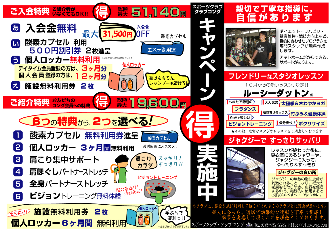 誰かが突然倒れるのに遭遇したときに、慌てず救急車が到着するまでにできることが、あります。救急処置の方法を知っている人が多いほど、多くの命を助けることができます。 心肺蘇生法の講習会は、消防署や日本赤十字社などで開催されていますので、万一に備え、講習を受けておくことをお勧めします。 クラブコングでは、春の入会キャンペーン第2弾は定員に達し終了いたしましたが、たくさんのご要望があり、引き続きキャンペーンをする事にいたしました。入会者特典は、入会金100%OFFに加えて酸素カプセル“Oasis O2(オアシスオーツー)の1回無料利用券、更にビジター券2枚をプレゼントと大変お得な特典が付いています。 この機会に是非、ご家族・お友達をお誘い合わせのうえ、ご見学・ご入会にお越しください。スタッフ一同、お待ちしております。 <文 定守 毅> |