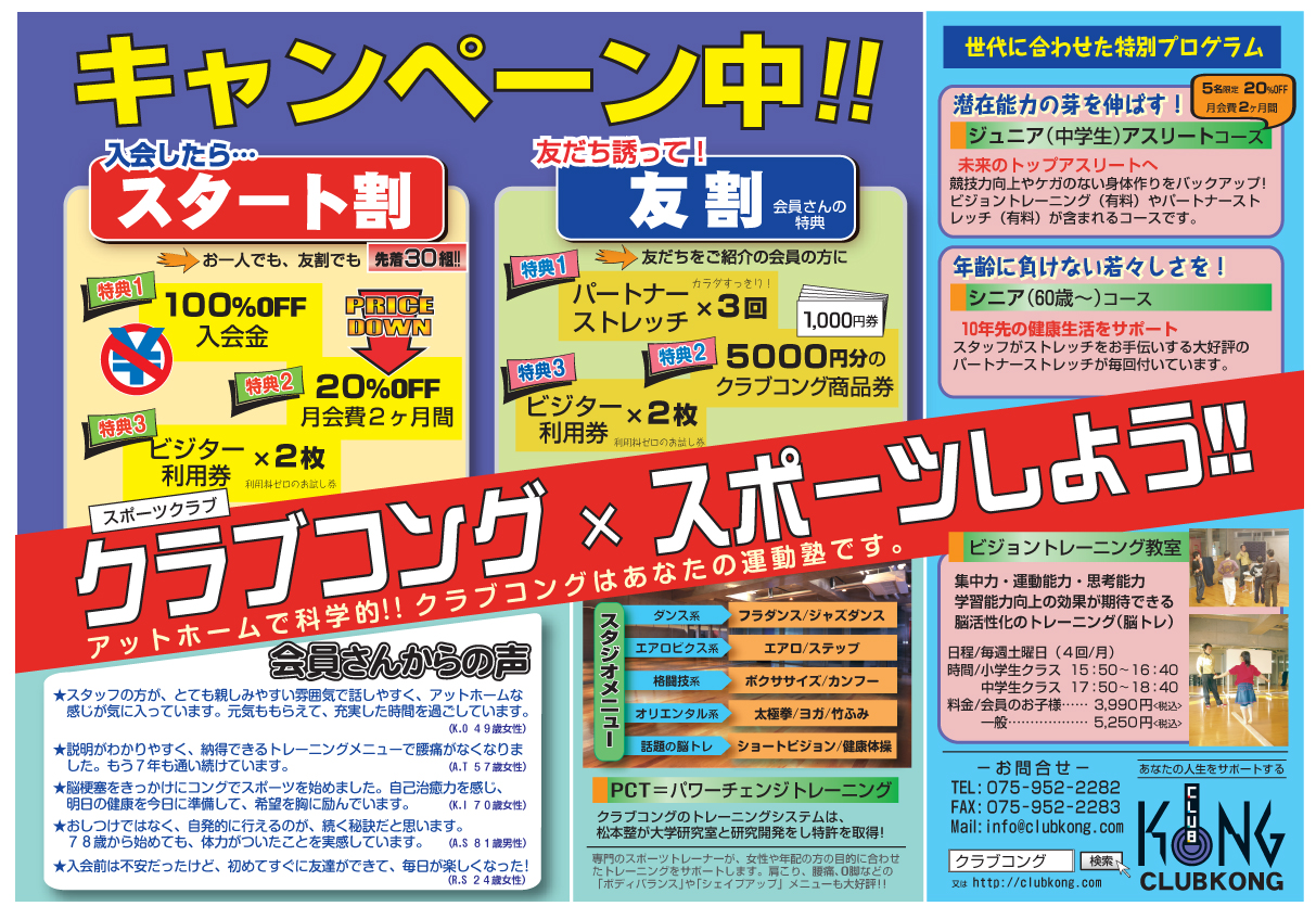年が明けて、一月の終わりにクラブコングのスタジオにてビジョン教室が、告知もされないまま、ひっそりと始まりました。 今回の健康情報は子供に対するビジョントレーニングの効果について具体的にお伝えしたいと思います。 ビジョントレーニングについては、今まで何度も書かせて頂きました。ビジョントレーニングとは、目=脳=身体のパイプを太くし連動を高めるトレー ニングです。目で見たものを脳で判断し身体を動かす。この連動をスムーズにします。また、目で得た情報を脳にデータとして保存する作業を、早く、キレイに、整理して、行えるようになります。 このビジョントレーニングは子供にも色々な効果をもたらします。 ★集中力、学習能力のup ★運動能力のup ★思考能力のup 今回はビジョントレーニングの子供に対する効果を書きましたが、ビジョントレーニングは、全ての人に効果を発揮します。 クラブコングでは、子供を対象にしたビジョントレーニング教室を土曜日に、会員の方を対象にしたショートビジョンを月曜日のAM10:20~AM10:50、水曜日のPM9:40~PM10:00の、2回のレッスンをご用意しています。この機会に脳の活性化に取り組みましょう! <文 濱崎 耕平> 追伸 |